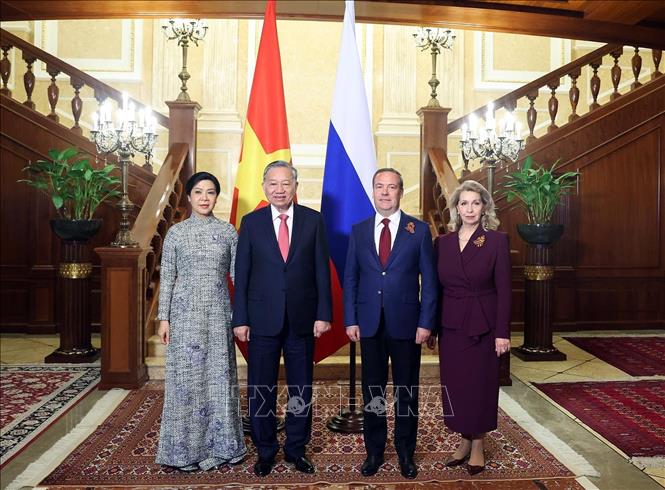 Tổng Bí thư Tô Lâm và Phu nhân với Chủ tịch Đảng nước Nga Thống nhất, Phó Chủ tịch Hội đồng An ninh Liên bang Nga Dmitry Medvedev và Phu nhân. Ảnh: Thống Nhất/TTXVN