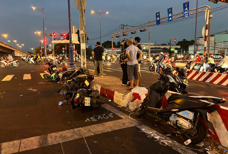Đến gần 19 giờ ngày 16/3, hiện trường vụ tai nạn do ô tô Mercedes đâm hàng loạt xe máy vẫn đang được lực lượng Công an TP Hồ Chí Minh giải quyết. Ảnh: CTV