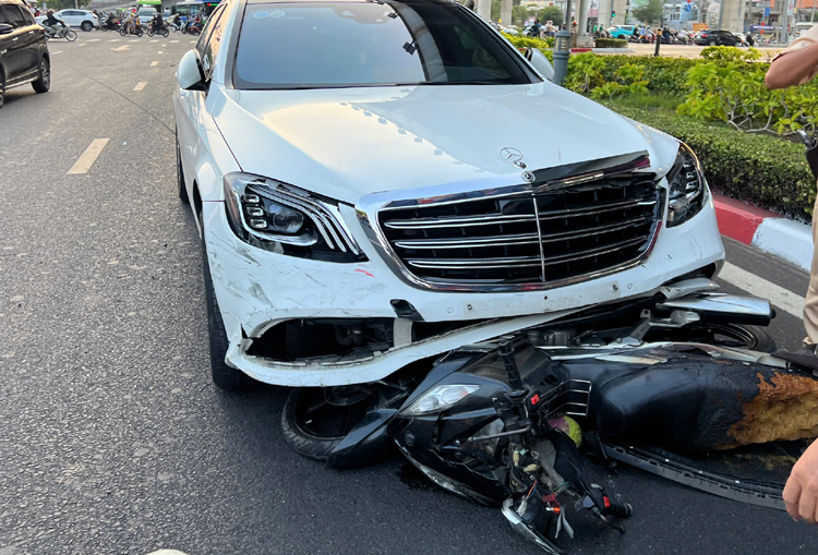 Hiện trường ô tô Mercedes đâm hàng loạt xe máy khiến nhiều người bị thương. Ảnh: CTV