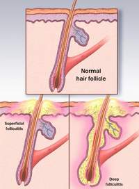 Nang lông bình thường (trên). Viêm nang lông nông (trái) và sâu (phải). |