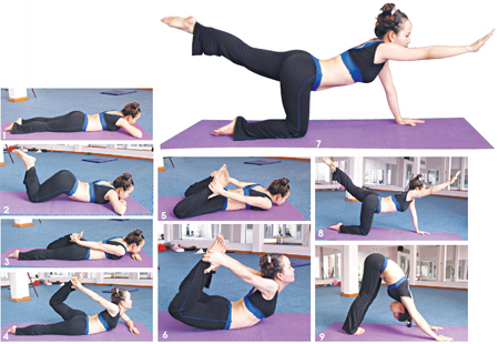 Động tác 1: Tư thế chuẩn bị nằm sấp, 2 tay đan lại để dưới cằm (hình 1). Từ từ hít sâu và co 2 chân lại rút về phía mông (hình 2), sau đó thở ra nhẹ nhàng và hạ chân xuống từ từ. Thực hiện 12 lần và giữ đều nhịp thở.